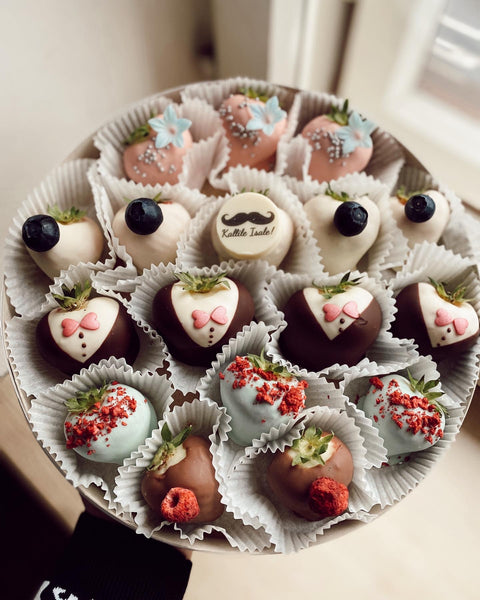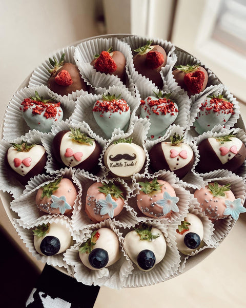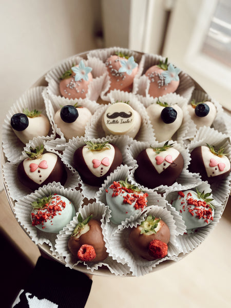 Koostis: värsked maasikad, valge šokolaad, piimašokolaad, tume šokolaad, külmkuivatatud vaarikas, vahvlililled, suhkrudekoor