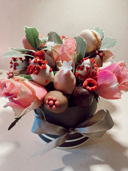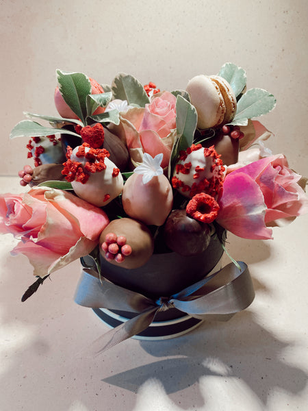 Koostis: Maasikad, valge šokolaad, tume šokolaad, piimašokolaad, külmkuivatatud vaarikad, vahvlililled, suhkrudekoor, makroonid, lilled